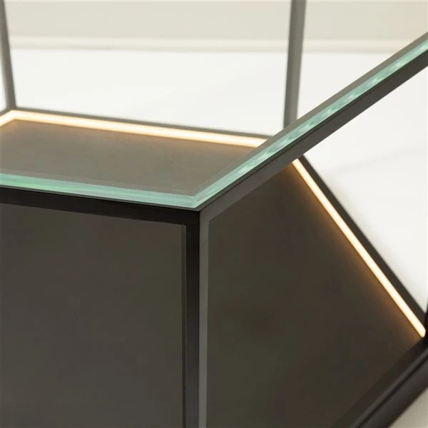 The Tavola collection feature accent illuminated LEDs around the perimeter of the high end tempered glassware (and where the legs meet the base). The frame of the table is a beautiful matte black finish. These tables are powered by rechargeable batteries. The LED can be activated by a dedicated button and last over 7 hours.