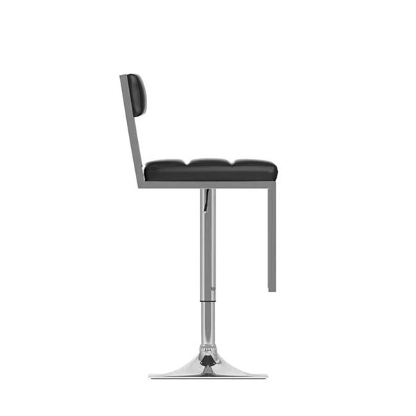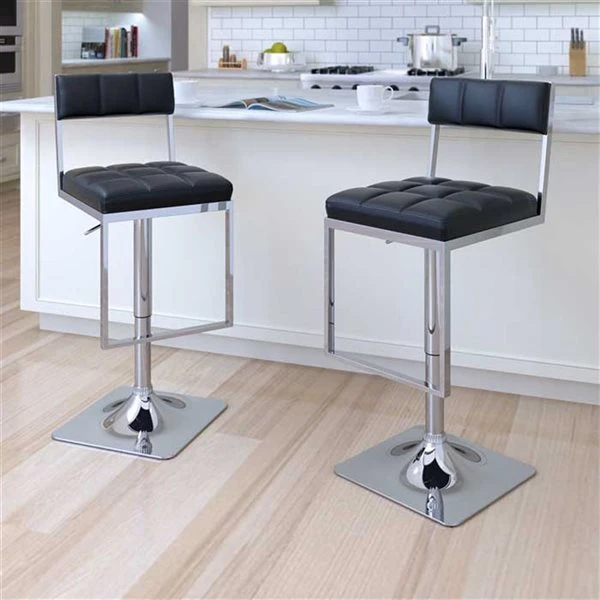 Add spice to any bar or kitchen island with the DAB-808-B swivelling barstool from CorLiving® featuring a uniquely square design with padded backrest in black faux leather. It features a chrome gas lift, square chrome base and footrest. A practical and stylish choice for a smaller bar space with no-worries washable black leatherette and a shiny chrome finish that will give a sparkle to any modern setting. The gas lift offers the option to adjust the seat to varying bar heights. A great contemporary addition to any home!