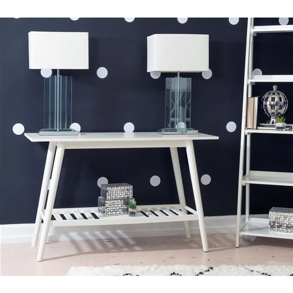 Elegant yet understated, this Culverton console table brings an exciting element of mid-century design to any living room, kitchen, or entryway. The splayed legs made of solid rubberwood join a smooth MDF tabletop to form a strong base as well as an eye-catching silhouette. Fastened below is a slatted bottom shelf for open storage or additional displays, perfect for laying out your favourite books or organizing cooking supplies in an easy-to-reach place. Pair with the matching coffee and end tables from the Culverton collection to complete the look.