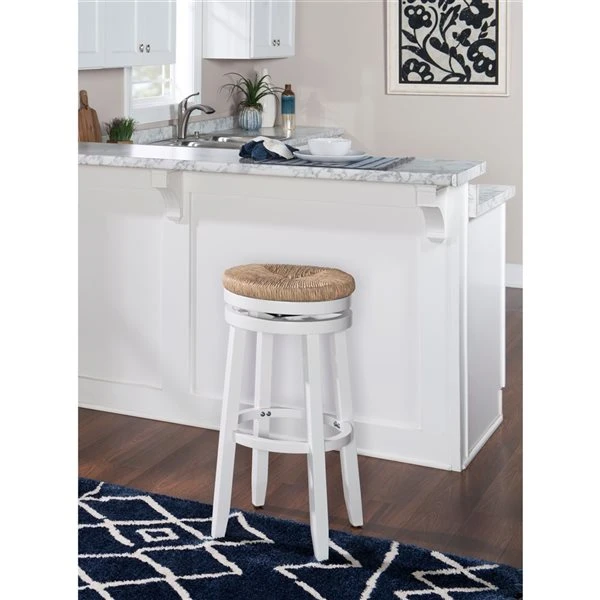 This bar stool combines a timeless aesthetic with contemporary design features to bring exciting new seating options to your living space. The natural handwoven seagrass seat swivels 360 degrees on top of a sturdy solid rubberwood base. The slightly splayed legs are painted in white and given extra support by a round footrest. A seat height of 31.5-in makes this stool perfect for bar heights of 41 to 43-in and can support up to 275 lb.