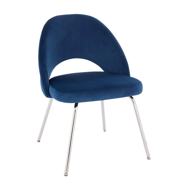 Modern dining chair with soft and comfortable blue velvet upholstery, with shiny stainless steel metal legs.