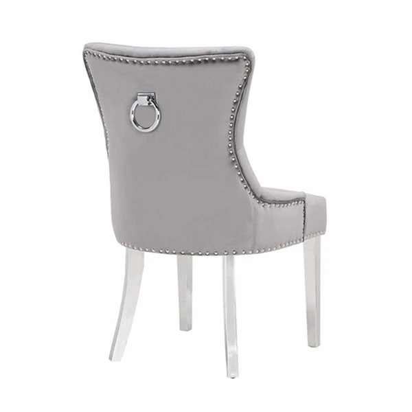Modernity in a classy style, this tufted dining chair with nailhead trim and a round ring in the back; a strong base made of a wooden frame, high-density foam, velvet upholstery, and stainless-steel legs.